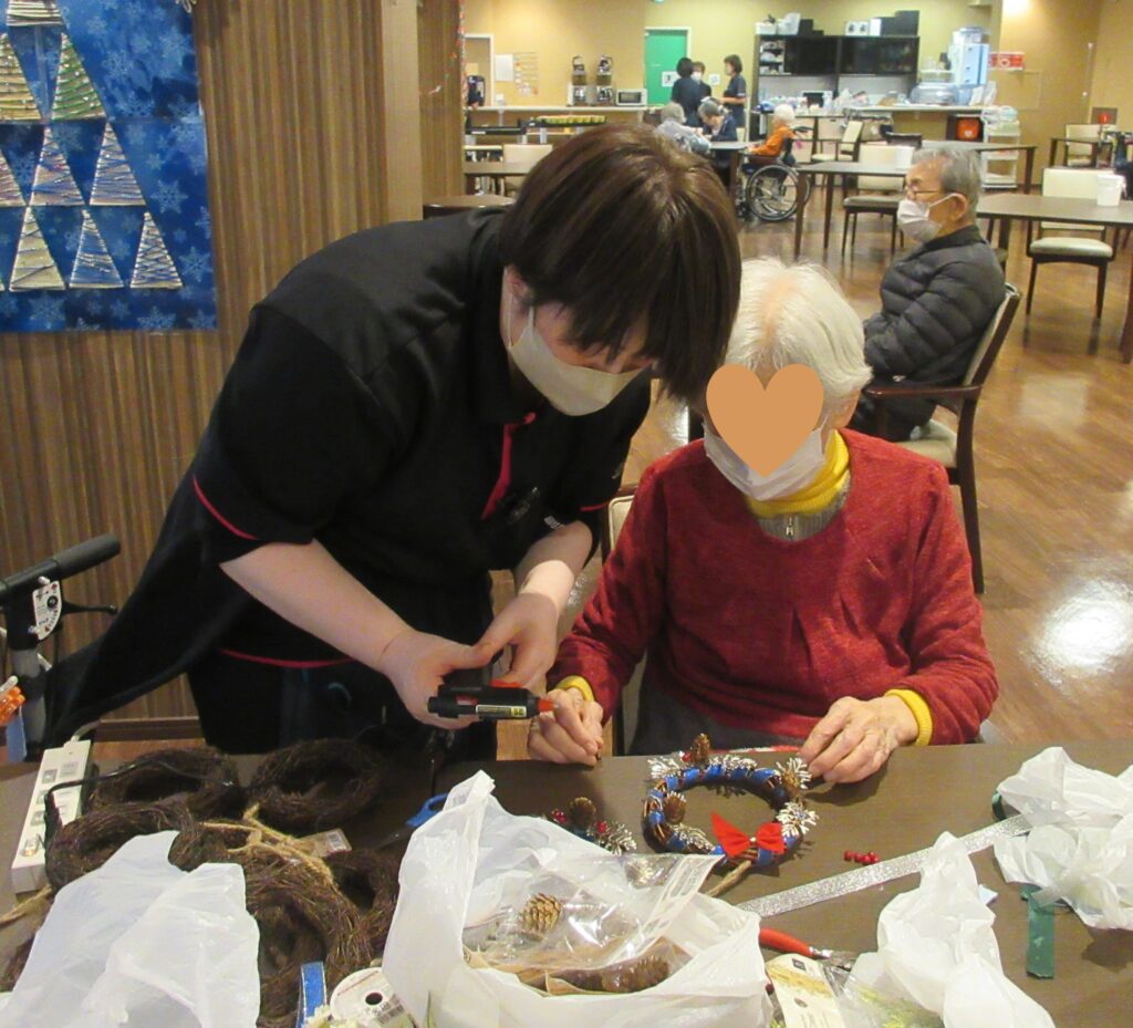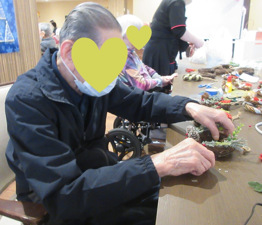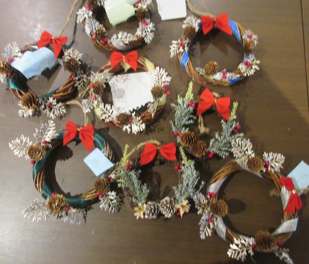 ①クリスマスリース作りをいたしました。